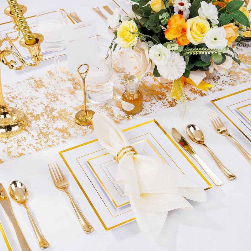 Set 50 Platos Cuadrados Blancos Reutilizables Borde Líneas Blanco Ibiza